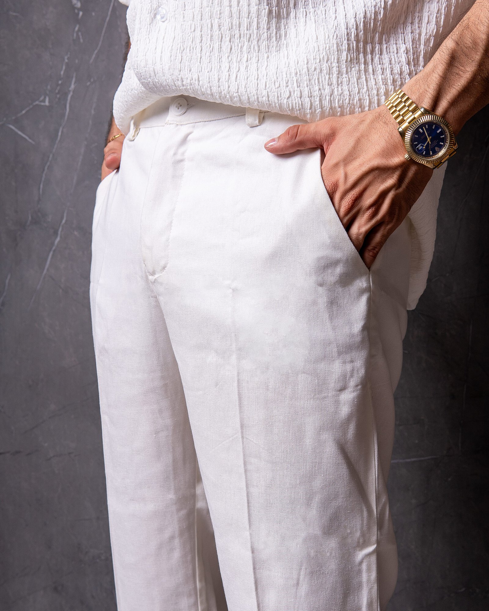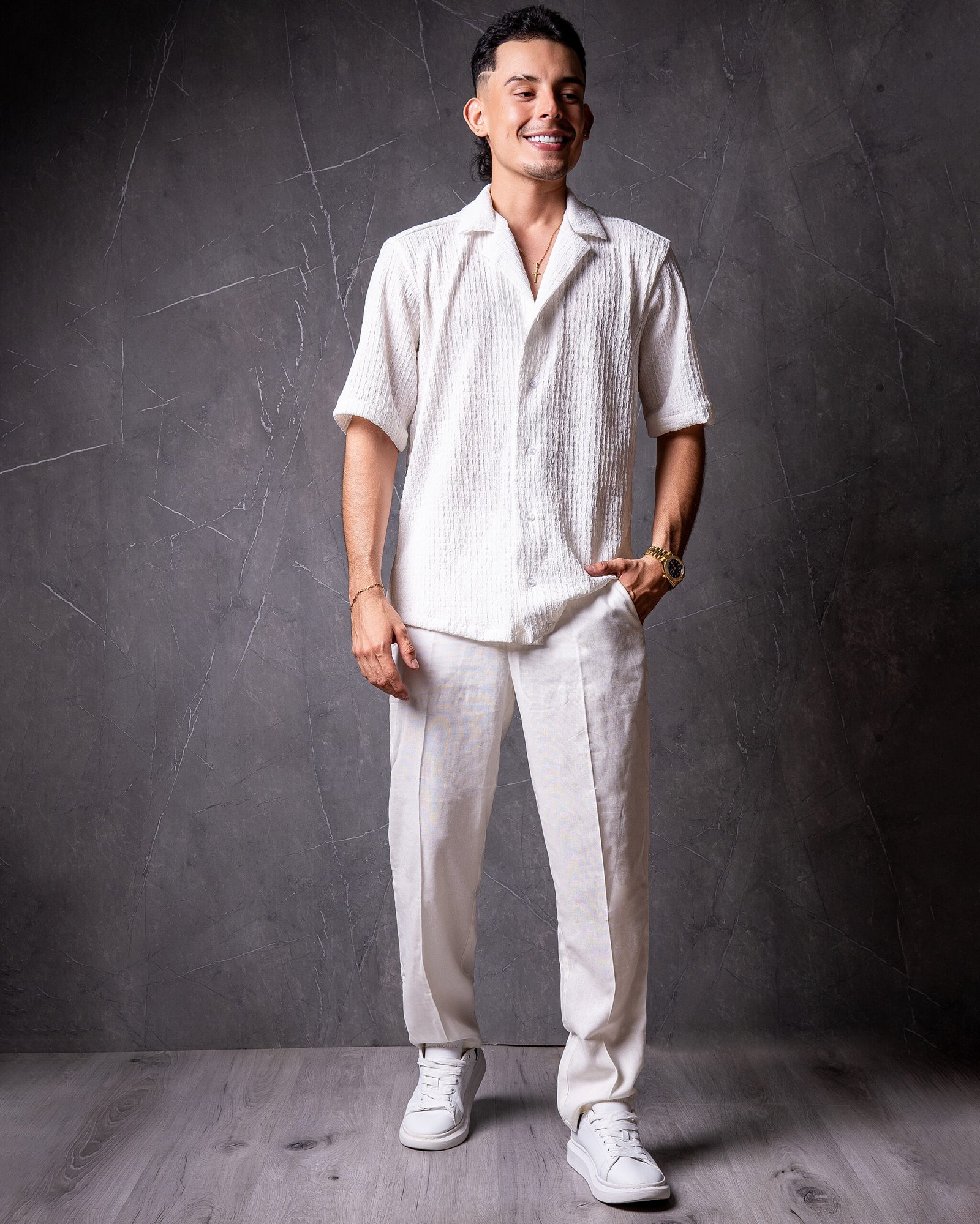 Este set “Italia High Largo” ofrece una combinación perfecta de estilo y comodidad. Confeccionado en un tejido ligero y texturizado, este conjunto incluye una camisa de manga corta y un pantalón de corte recto, ambos en un elegante tono blanco que es ideal para cualquier ocasión. Su diseño relajado y sofisticado es perfecto para mantenerte fresco y con clase en eventos casuales o formales.